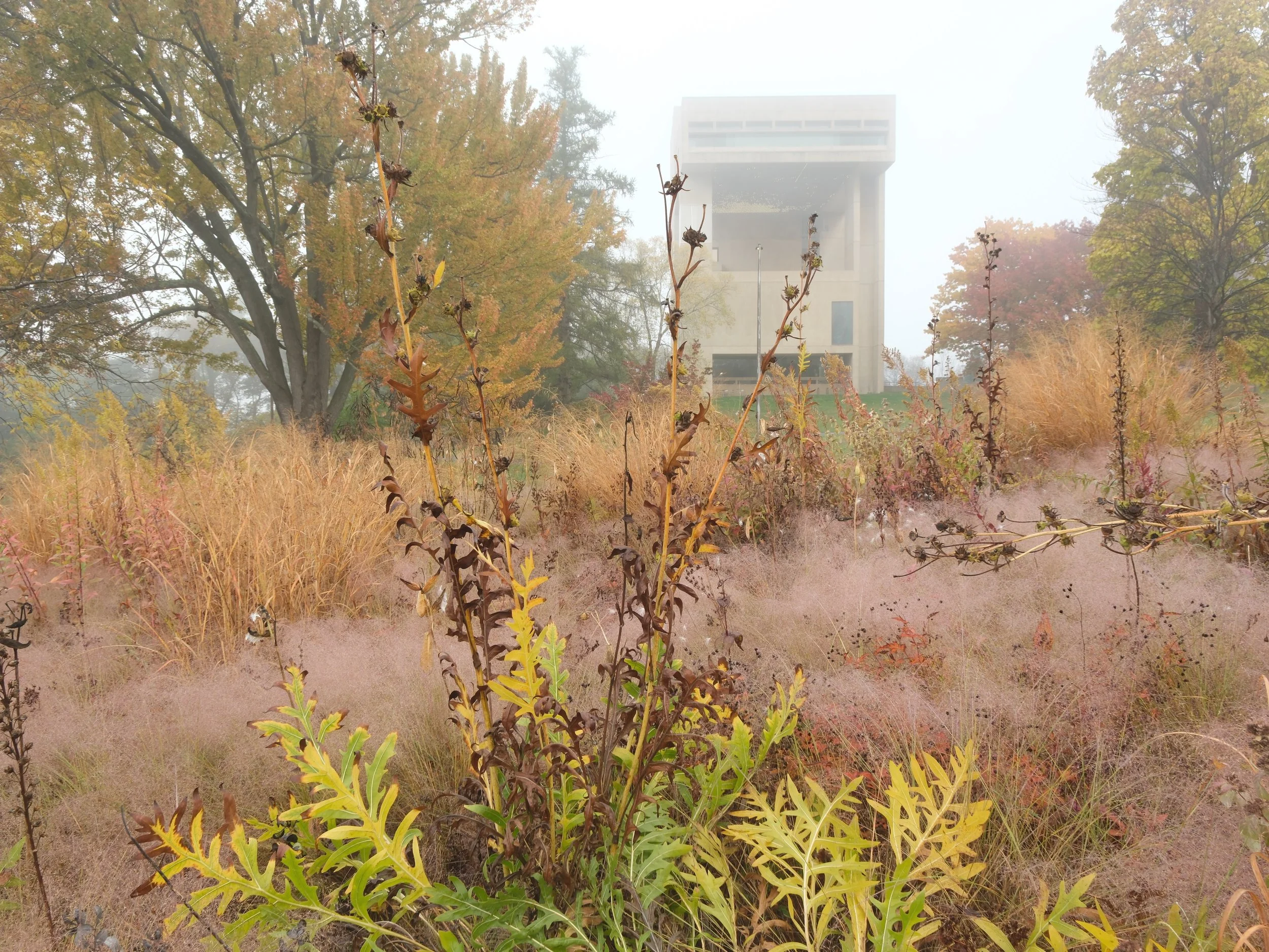 Although the surroundings of the iconic Slope appear pastoral, the site has a history of disturbance and compaction. Part of the site was clay; part was a layer of gravel from earlier construction. A community of introduced turf grasses and broadleaf invasive species covered the site. Planted species were selected that could thrive in these conditions.