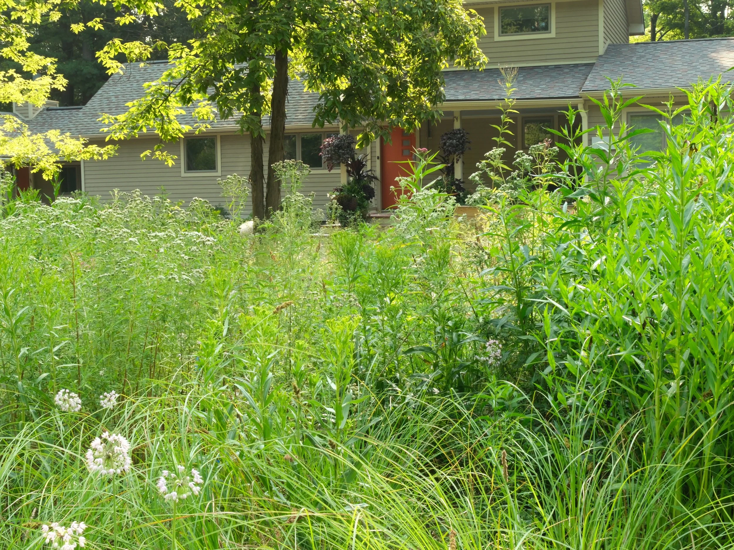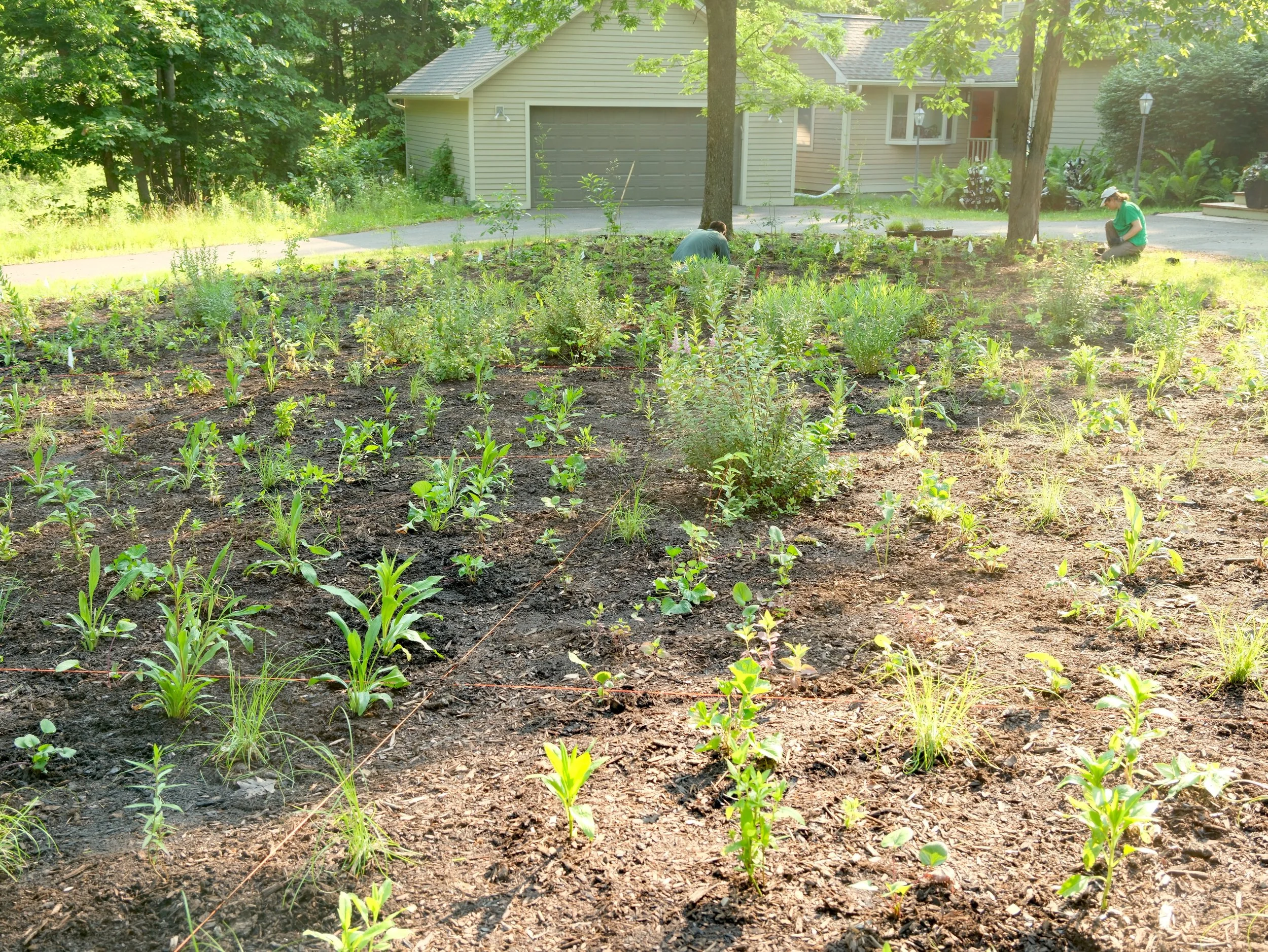 Six Mile Meadow creates an ecologically vibrant and biodiverse community of sedges and herbaceous plants on a site of wet clay that previously contained lawn.